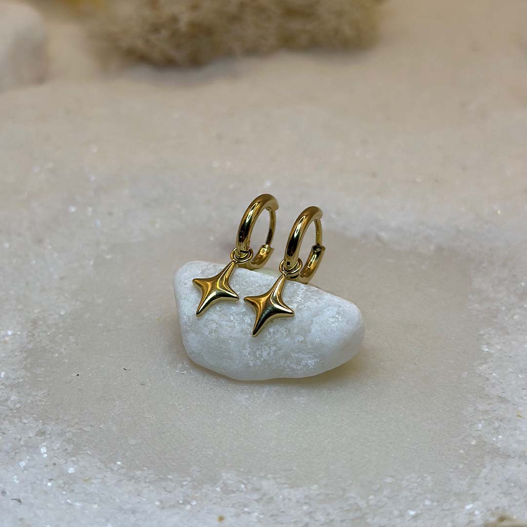 Estella, ce sont des boucles d’oreilles en acier inoxydable pendantes, qui brillent comme des étoiles. Avec leur design épuré, composé d’un crochet rond finement poli et d’un pendentif en forme d’étoile, elles incarnent à la fois la simplicité et la féminité qui scintille en chacune des femmes. Leur éclat doré illumine le visage et fait danser la lumière à chaque mouvement.